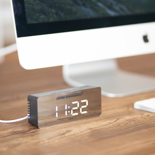 鏡面仕上げのクールなデザインでまとめられた「スターク・インダストリーズ」ロゴ入りデジタル置き時計。
