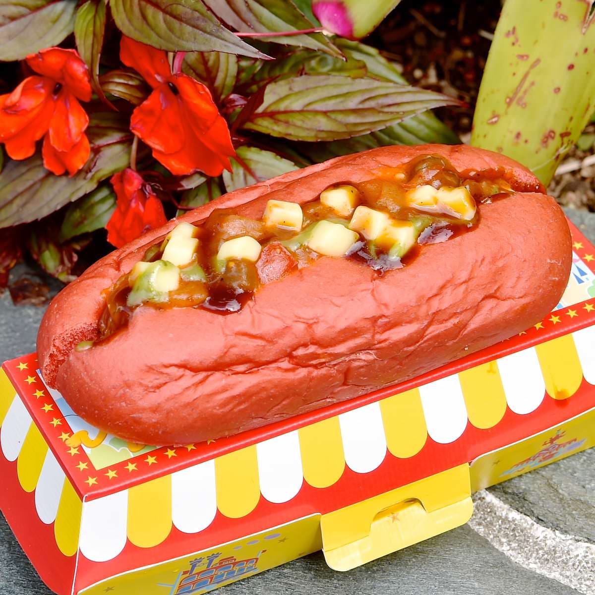 真っ赤なパンが目を引くホットドッグ。