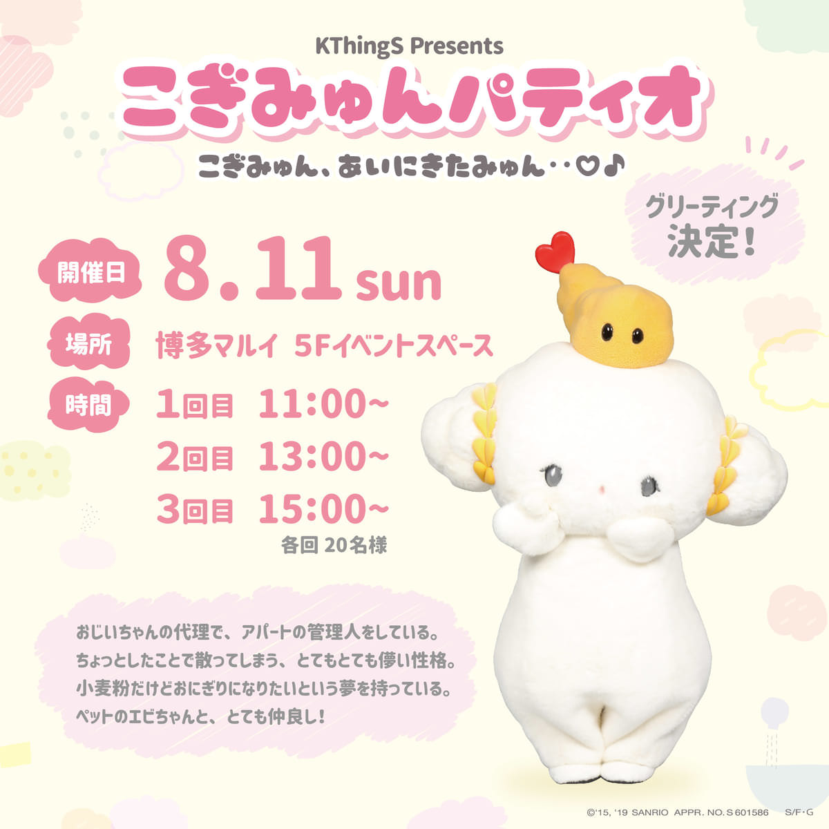 2019年8月10日(土)から8月20日(火)までの期間限定で実施される「KThingS Presents こぎみゅんパティオ こぎみゅん、あいにきたみゅん in 博多マルイ」の紹介でした☆