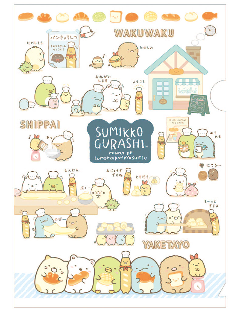 やさしいパン店長に見守られながら、パン教室でパンを作る「すみっコ」たちの様子がほのぼのと描かれています☆