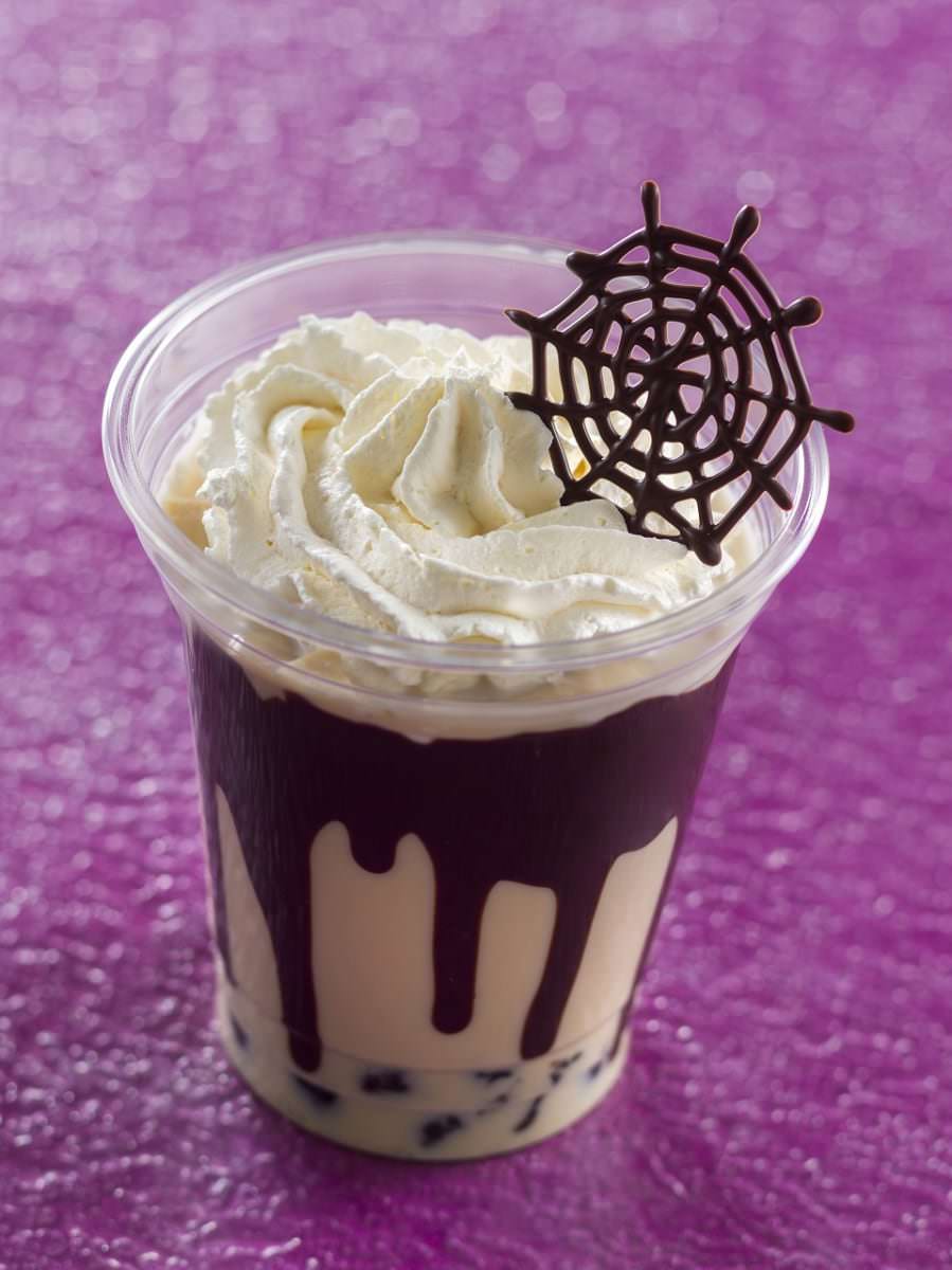 ミルク、アッサムティー、 チェスナッツシロップ、タピオカに、ホイップクリームとクモの巣モチーフのチョコレートがトッピングされたスペシャルドリンク。