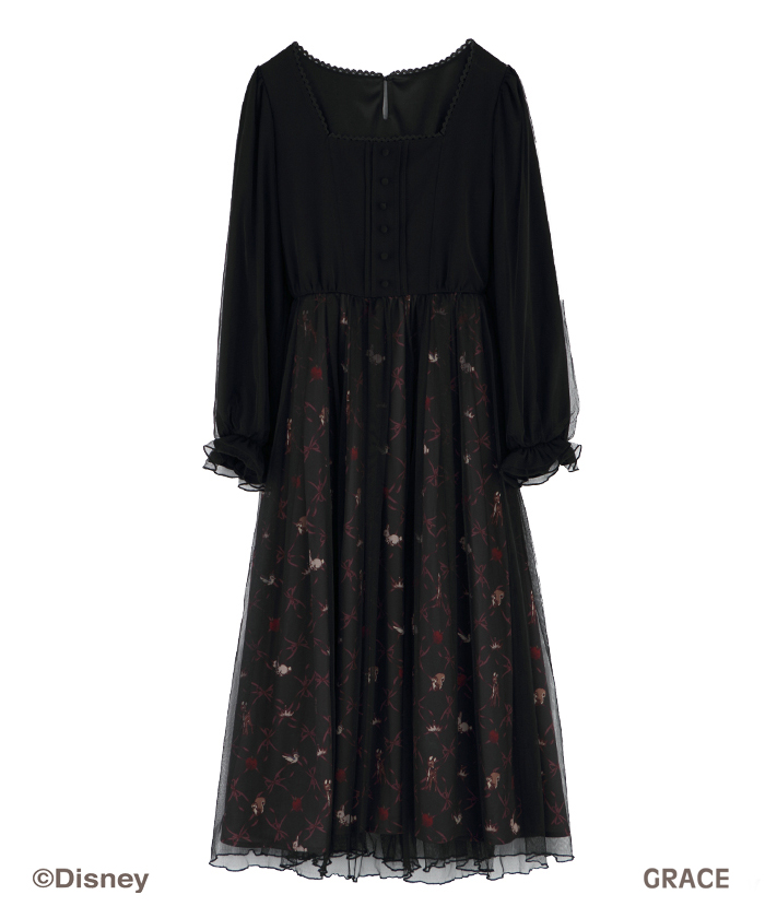 ワンピースは、森の動物たちやりんご、ティアラが描かれたオリジナルテキスタイルにチュールが掛かったスカート、そして上品な光沢の生地を使用した甘すぎないデザインに仕上がっています。