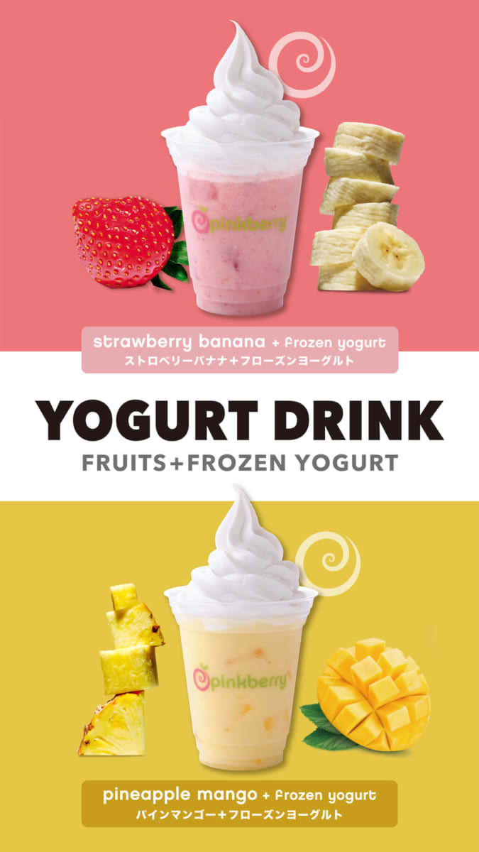 「フローズンヨーグルト ドリンク ストロベリーバナナ+フローズンヨーグルト」と「フローズンヨーグルト ドリンク パインマンゴー+フローズンヨーグルト」は8月5日(月)よりフローズンヨーグルトショップ『ピンクベリー』全国4店舗にて期間限定で発売されます。