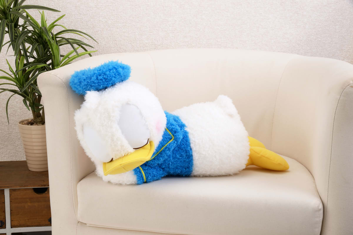 赤いほっぺに寝そべりポーズの「ドナルド」の姿にほっこりと癒されますね。