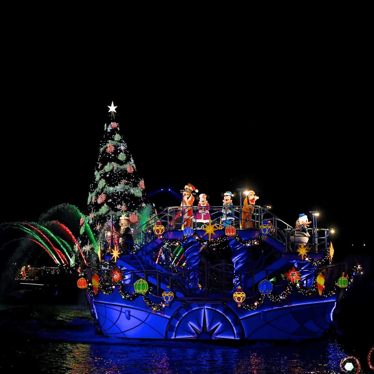 「It’s Christmas Time!」と書かれたバナーが空を舞い、ポインセチアをあしらった美しいツリーが水上に立ち上がると、ショーの幕開けです。