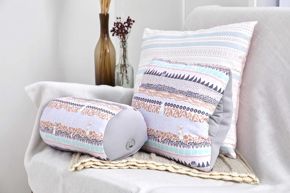 手触りの良い生地にムーミンとキャラクター達の絵柄をあしらった、もちもちフワフワのコードレス温感クッション。