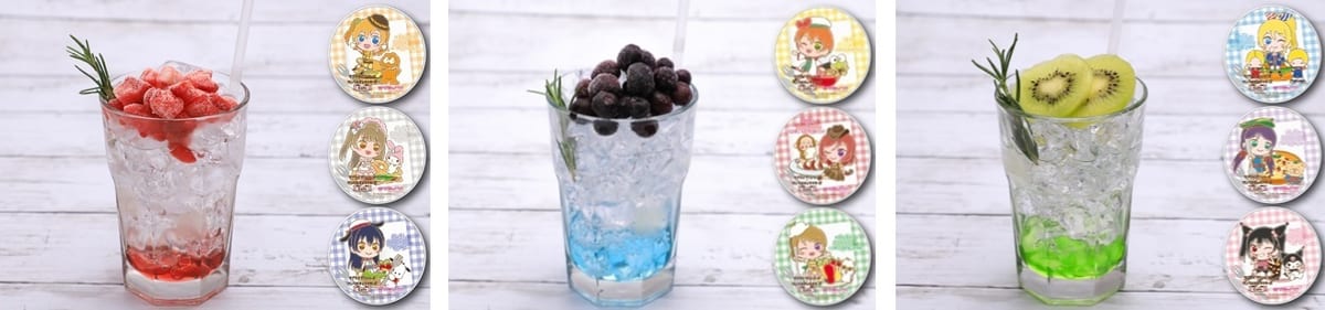 「ブルーベリーたっぷり!ラムネソーダ」1杯注文につき、「星空 凛×けろけろけろっぴ」「西木野真姫×おさるのもんきち」「小泉花陽×コロコロクリリン」コースターの中からランダムで1枚プレゼント。