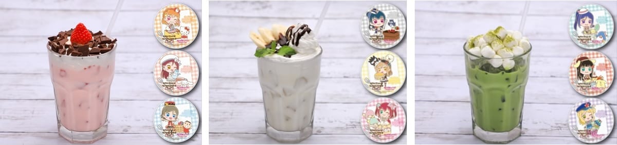 「チョコたっぷり!イチゴミルクドリンク」1杯注文につき、「高海千歌×ハローキティ」「桜内梨子×シナモロール」「渡辺 曜×みんなのたあ坊」コースターの中からランダムで1枚プレゼント。