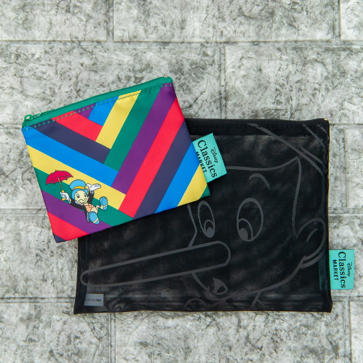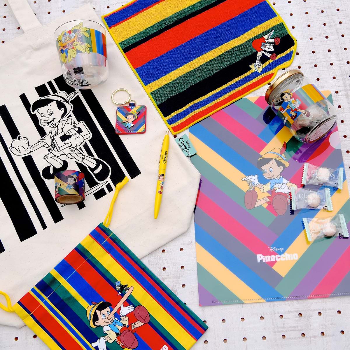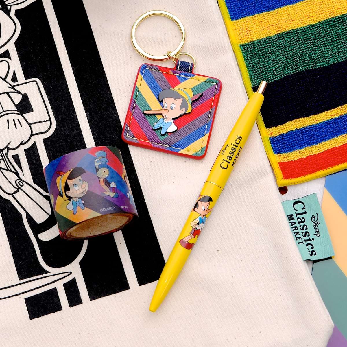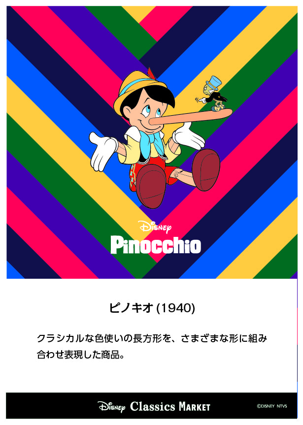 『ピノキオ』シリーズでは、クラシカルな色使いの長方形を、さまざまな形に組み合わせ表現した「Disney Classics MARKET」オリジナルの限定アートを使用したグッズが多数登場しています。