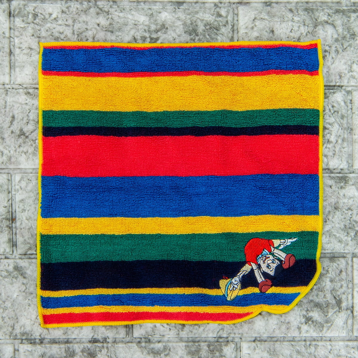 クラシカルな色使いの様々な大きさの長方形が並んだ『ピノキオ』のハンドタオル。