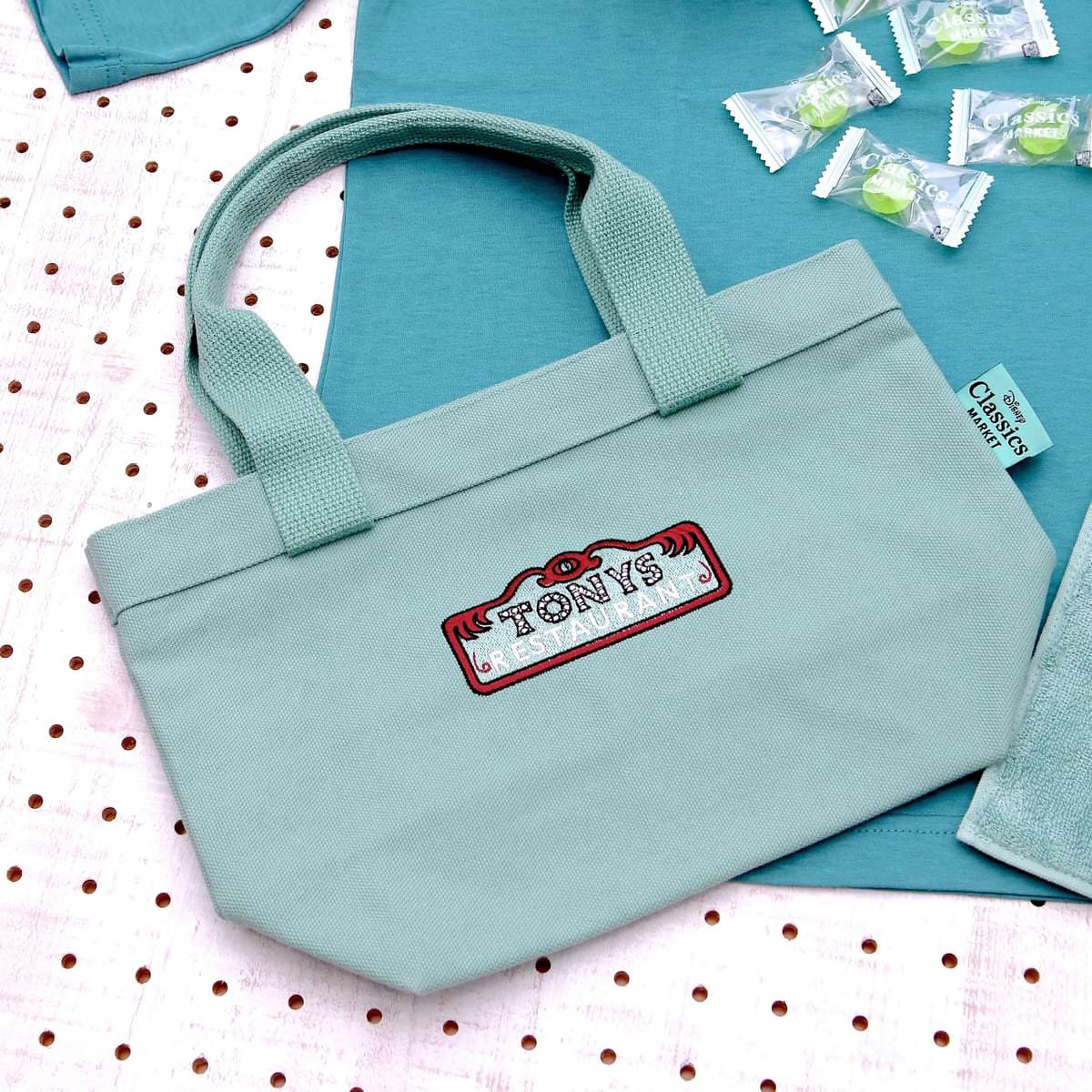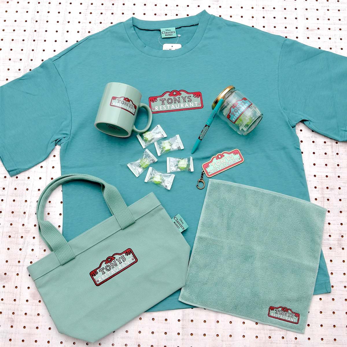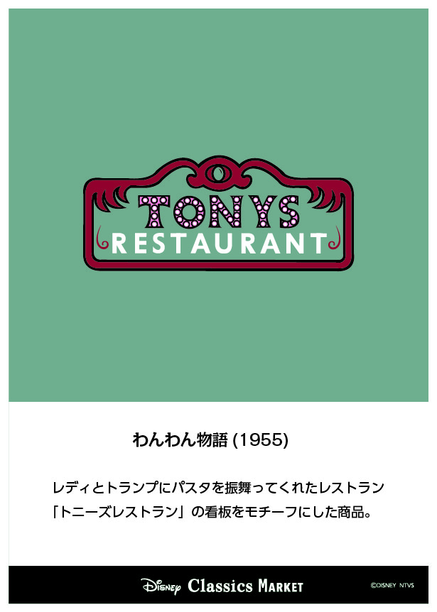 『わんわん物語』シリーズでは、「レディ」と「トランプ」にパスタを振舞ってくれたレストラン「トニーズレストラン」の看板をモチーフにした「Disney Classics MARKET」オリジナルの限定アートを使用したグッズが多数登場しています。