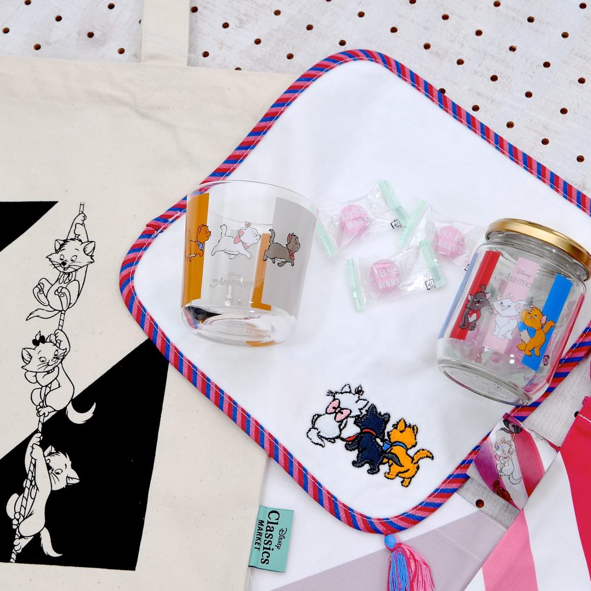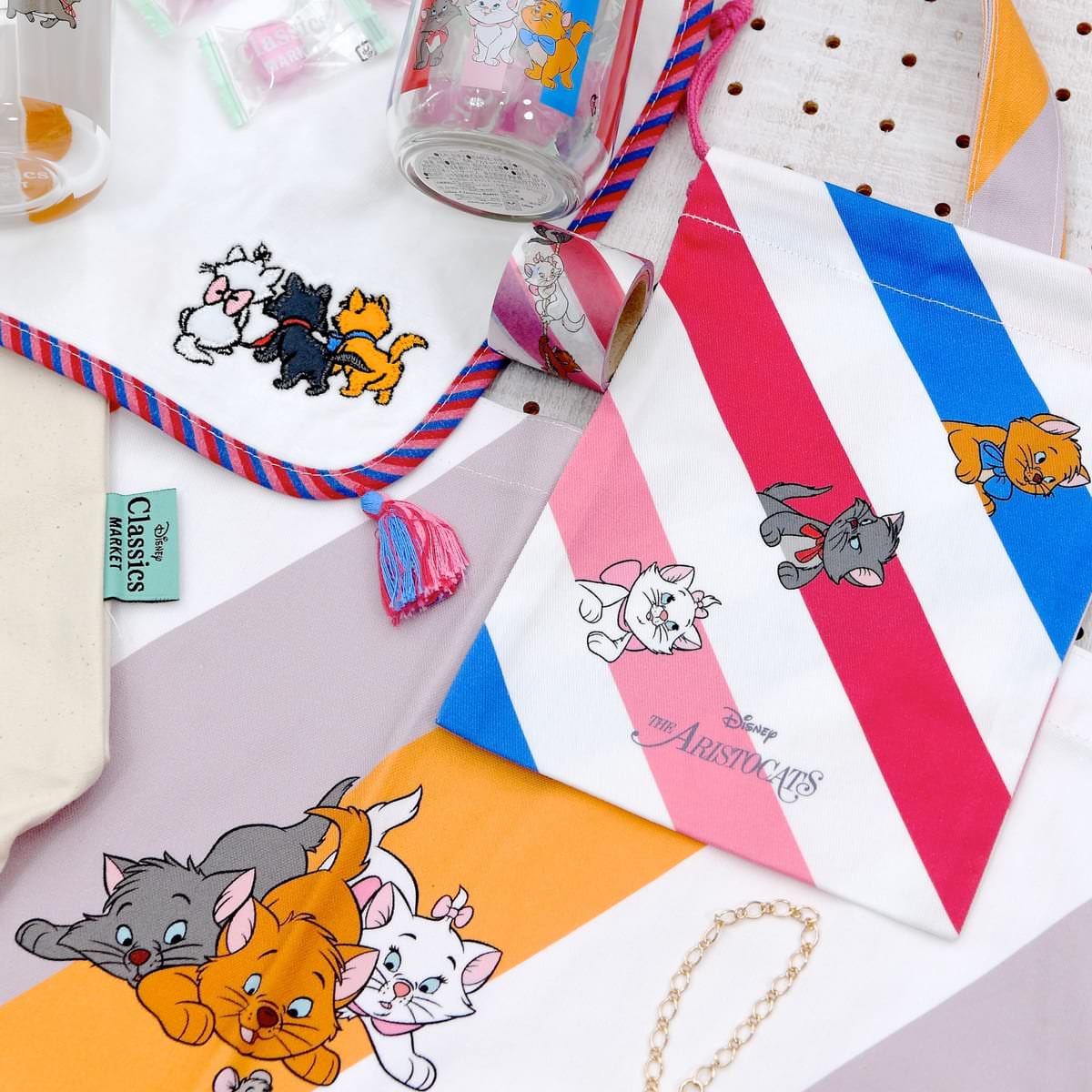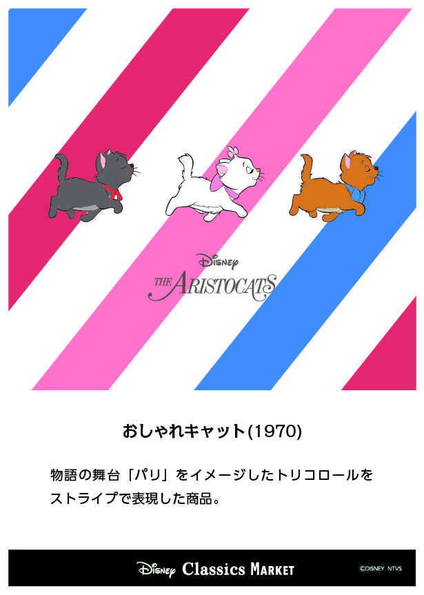 『おしゃれキャット』シリーズでは、物語の舞台「パリ」をイメージしたトリコロールをストライプで表現した「Disney Classics MARKET」オリジナルの限定アートを使用したグッズが多数登場しています。