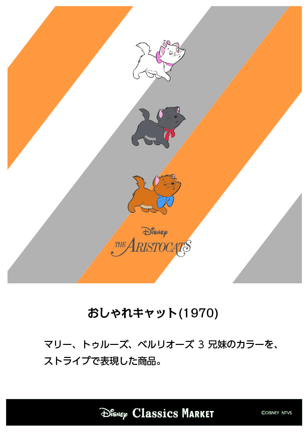 『おしゃれキャット』シリーズでは、「マリー」「トゥルーズ」「ベルリオーズ」3兄弟のカラーを、ストライプで表現した「Disney Classics MARKET」オリジナルの限定アートを使用したグッズがラインナップされています。