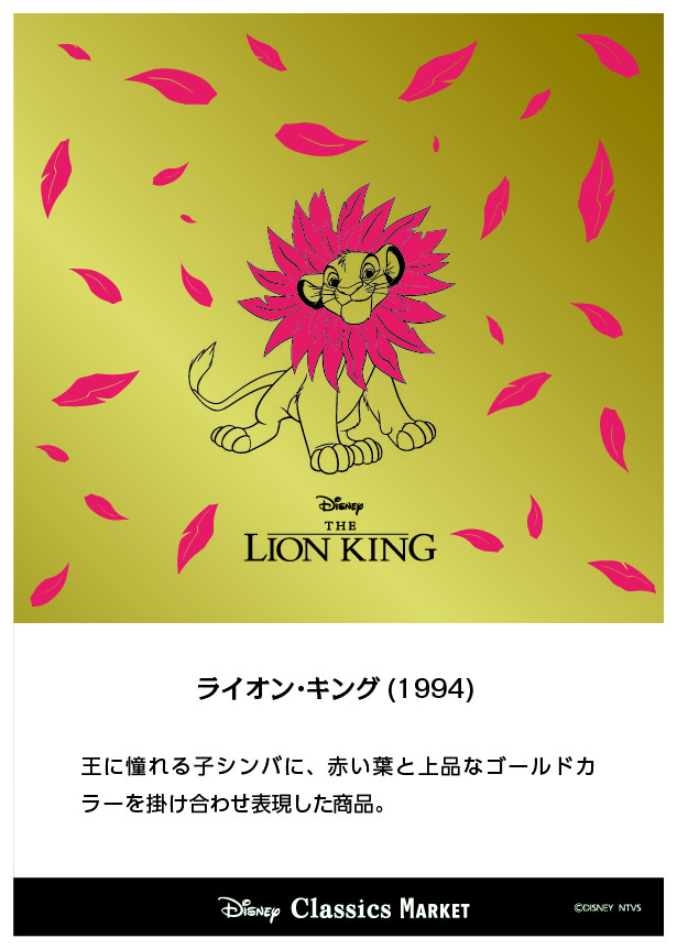 『ライオン・キング』シリーズでは、王に憧れる「子シンバ」に、赤い葉と上品なゴールドカラーを掛け合わせ表現した「Disney Classics MARKET」オリジナルの限定アートを使用したグッズがラインナップされています。