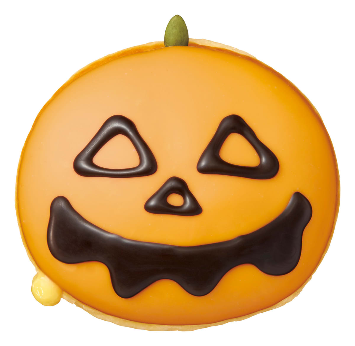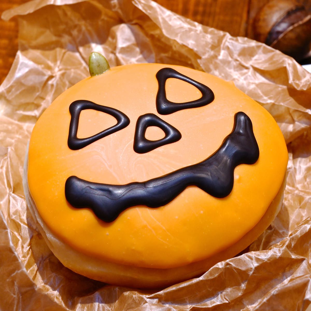 パンプキンチョコの顔にビターチョコでいたずらっぽい表情が描かれ、カボチャを使ったなめらかなパンプキンカスタードクリームが入ったドーナツです。