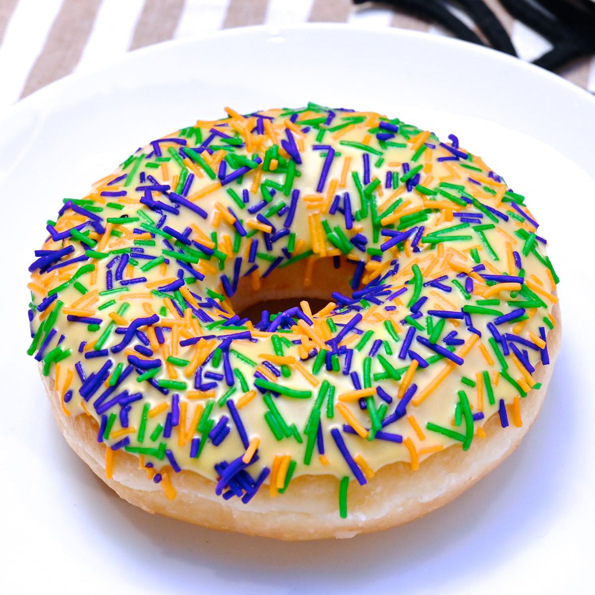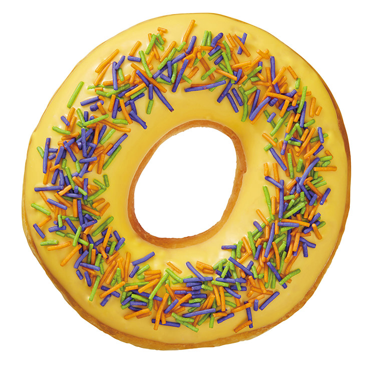 プリン味のチョコにハロウィンカラーのスプリンクルをちりばめたドーナツ。