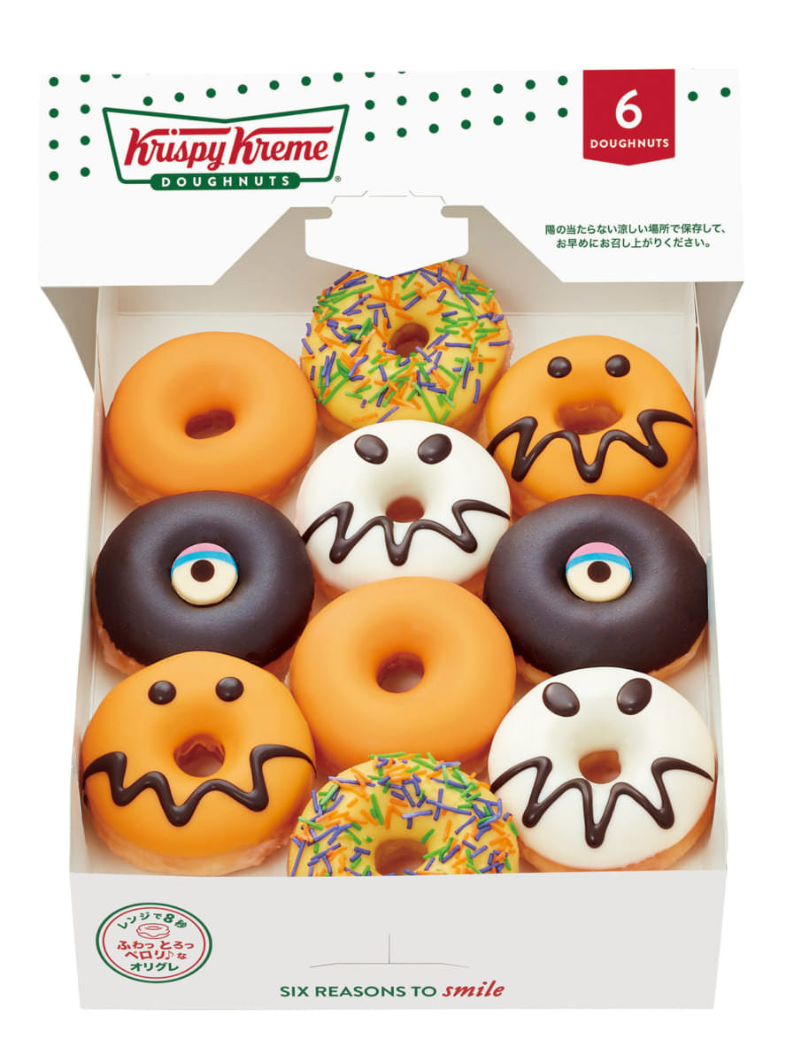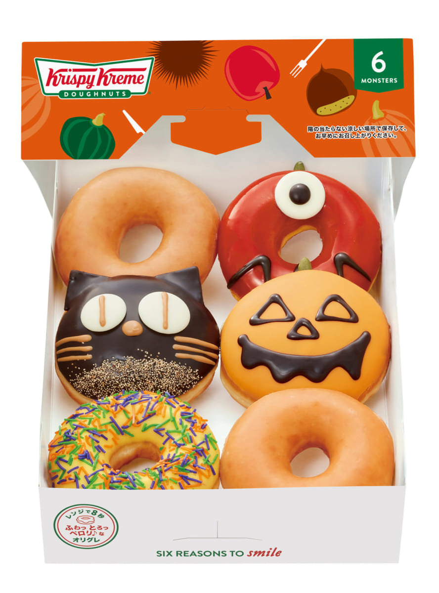 パンプキン カスタード ジャック、黒ネコ “マロン”、アップル キャラメル モンスター、 ハロウィン スプリンクル、秋の実りを味わえるハロウィンドーナツと人気のオリジナル・グレーズドが入った、 6個入りボックス。