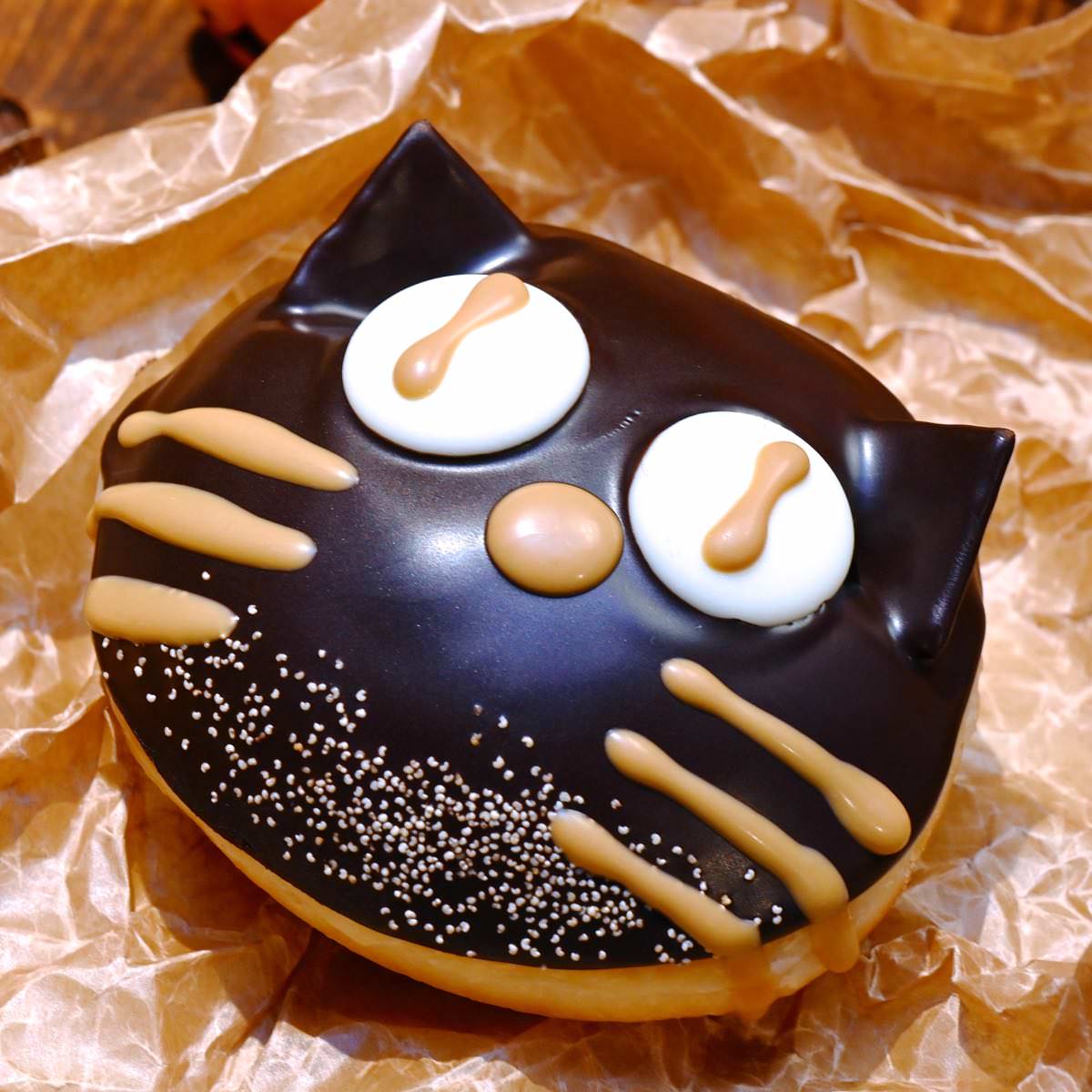 ビターチョコの顔にサクサククラッカーの耳、ホワイトチョコの大きな目の黒ネコ。