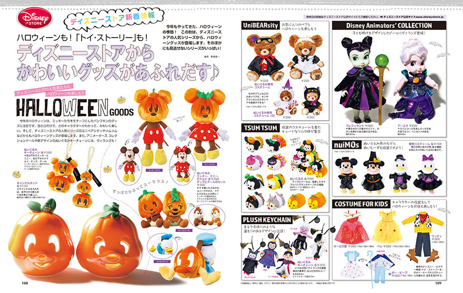 ミッキーたちをモチーフにしたパンプキンのグッズや、ハロウィーンの仮装をしたユニベアシティ、ツムツムなど、この時季ならではのディズニーストアのグッズも特集されています。