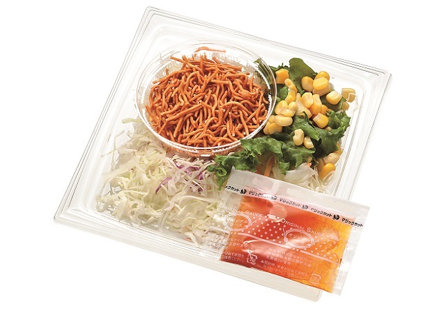 ベビースターラーメンと野菜に、ラー油ドレッシングをかけて楽しむサラダラーメン。
