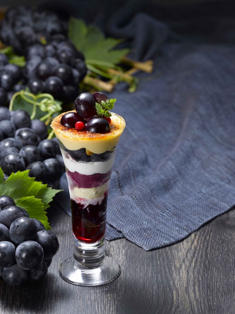 おなじみのカリッとキャラメリゼされたクレームブリュレに、巨峰や葡萄ソルベ、葡萄ゼリーと、葡萄の様々なおいしさが楽しめる贅沢なブリュレパフェ。