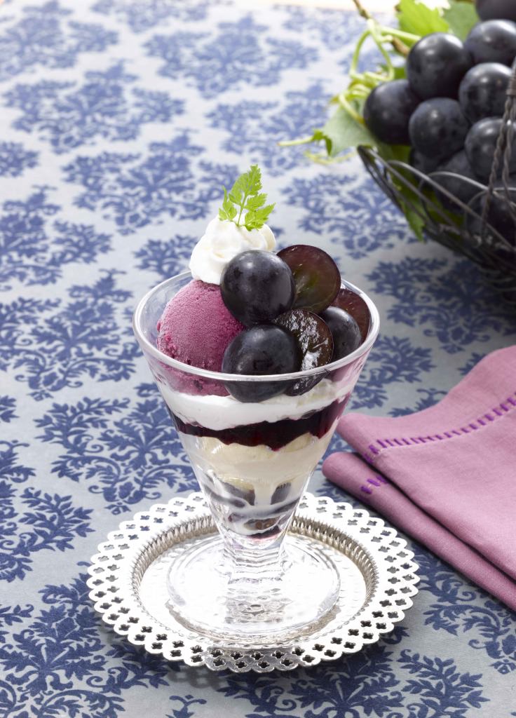 ジューシーな巨峰、葡萄ソルベや葡萄ゼリーに、バニラアイスを合わせた、葡萄の芳醇な香りが際立つデザートです。