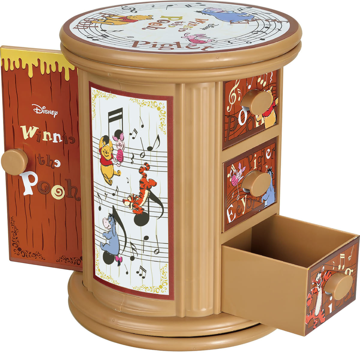 はちみつがトロ〜リと垂れている扉には“Winnie the Pooh”のロゴが、 引き出しには「プーさん」、「ピグレット」、「イーヨー」、「ティガー」の姿がデザインされています。