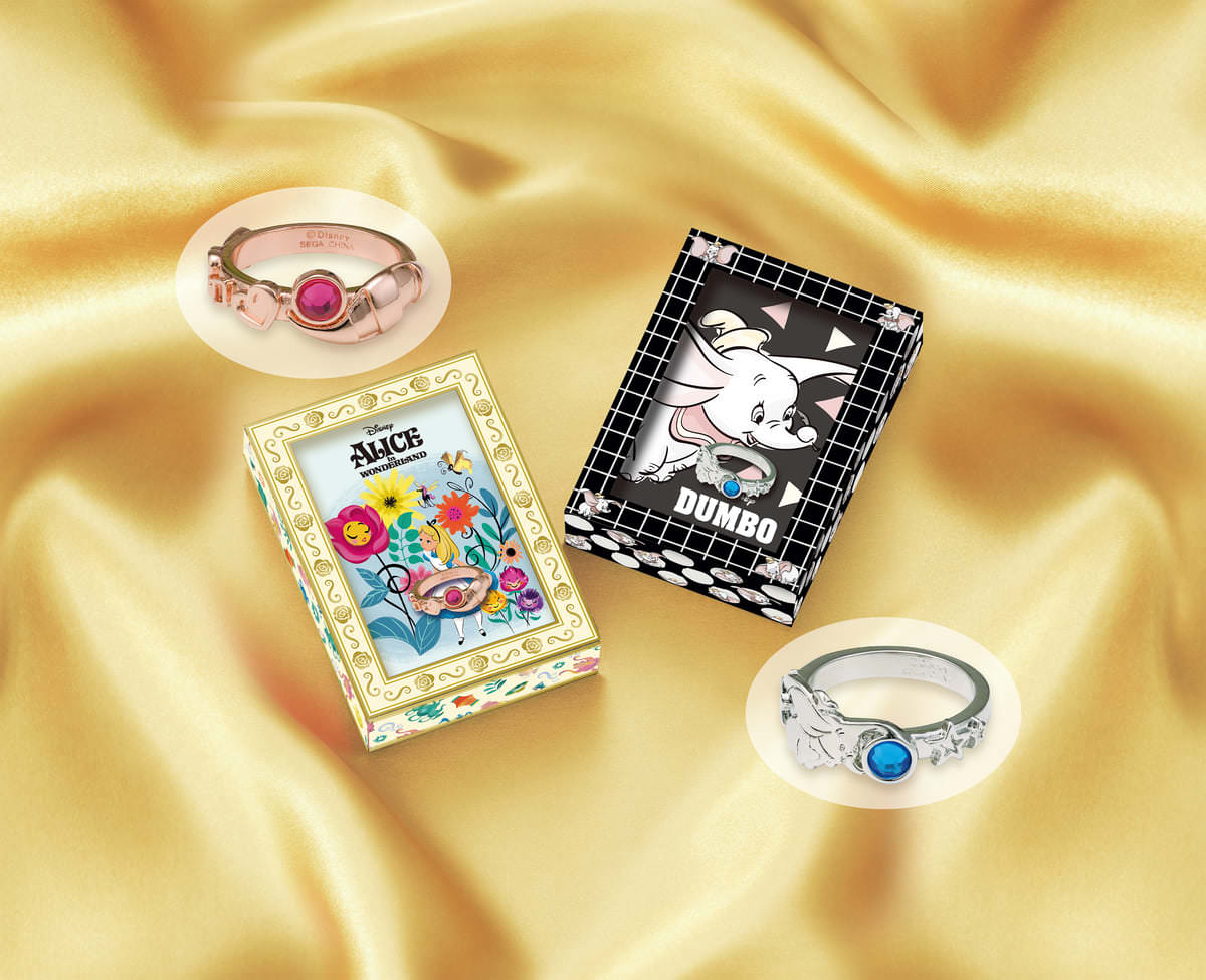 キュートなパッケージに入った『ふしぎの国のアリス』と『ダンボ』のリング。