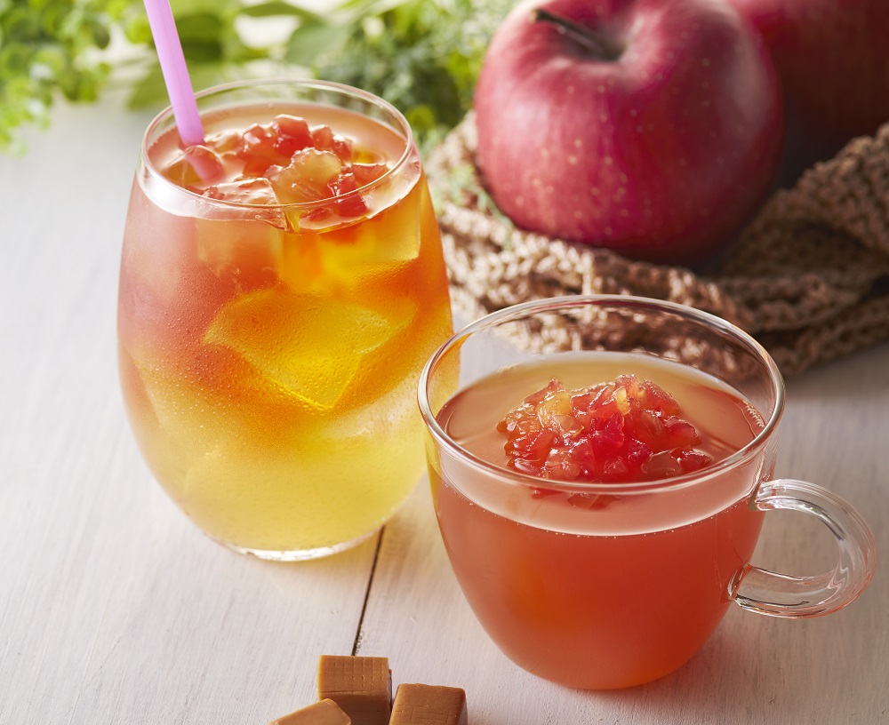 アップル果汁が使用されたフルーティな紅茶に、キャラメリゼをイメージした食感が楽しい2色のリンゴ果肉がトッピングされています。