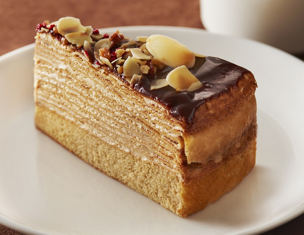 カラメルクリームのほろ苦い味わいに、アーモンド&ウォルナッツの香ばしさがアクセントを添えるミルクレープです。