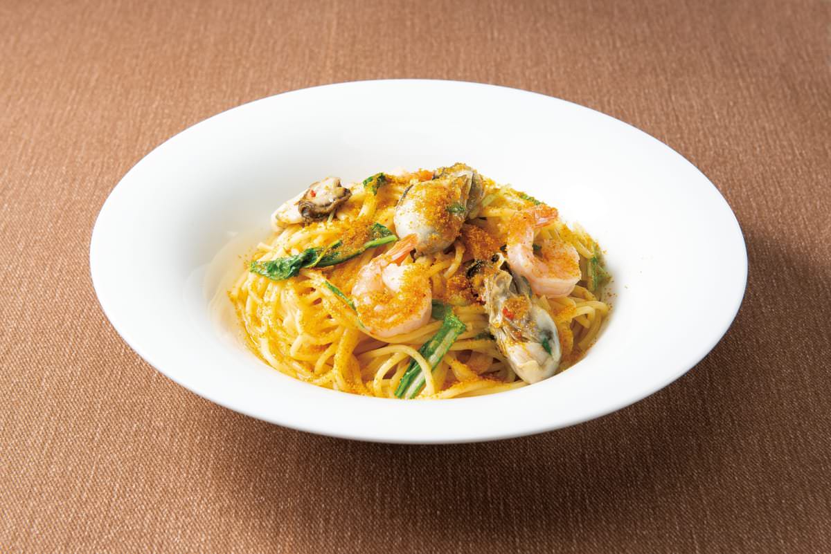 魚介の旨みと、にんにくの香りがきいたオイルベースのソースに、ふっくら柔らかな兵庫県播磨灘産の牡蠣と海老、さらにイタリア・サルディーニャ島の「からすみ」を合わせたごちそうパスタです。