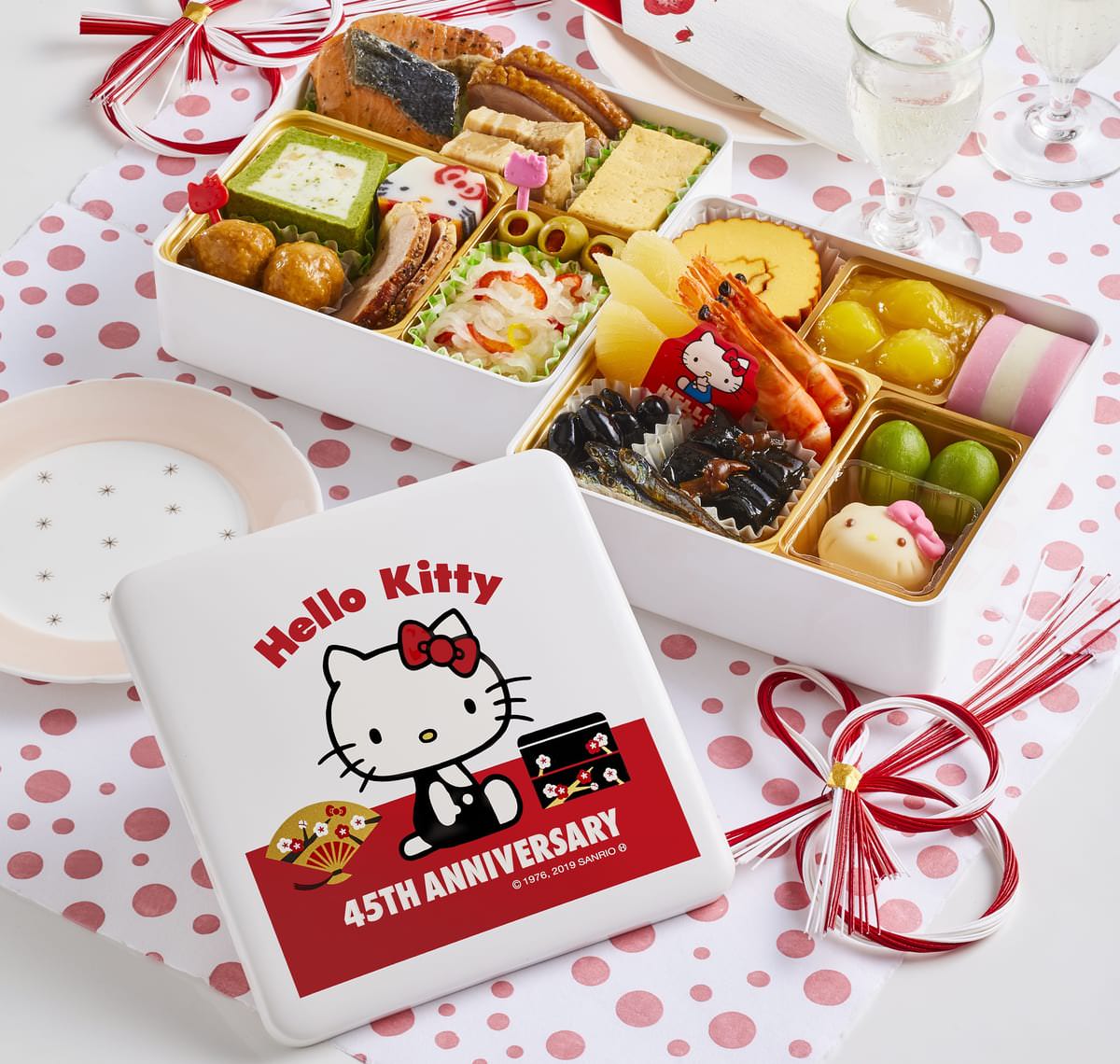お重に使われているのは『ハローキティ』誕生45周年を記念し、デビュー当時のデザインをイメージした紀文限定デザイン。