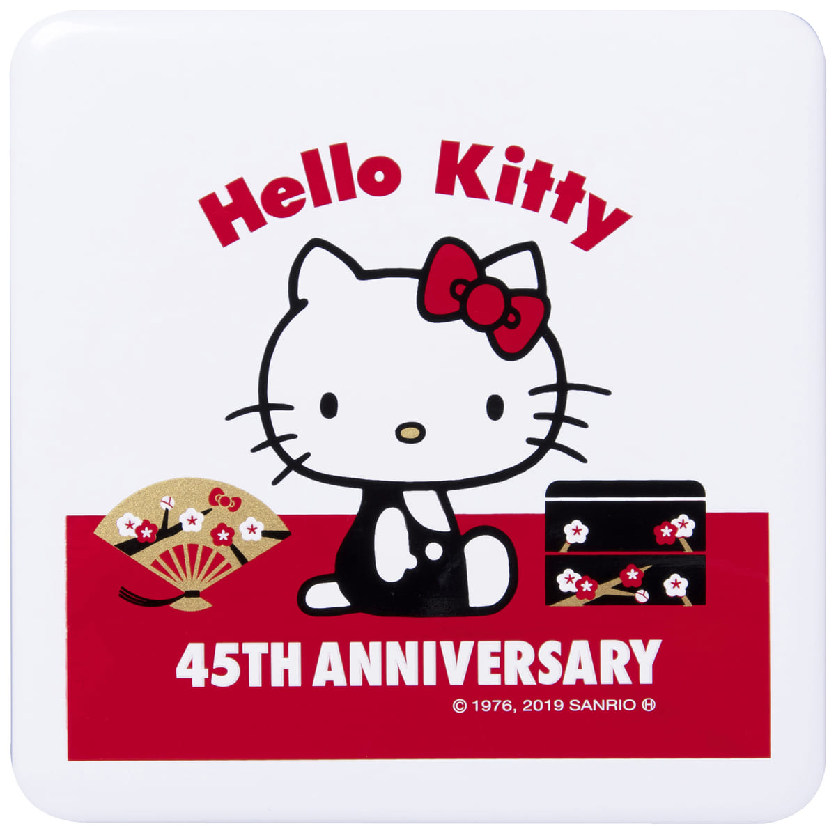 デビュー当時の1970年代の姿をイメージした、横座りのキティちゃんが描かれた2020年限定デザインのお重箱。