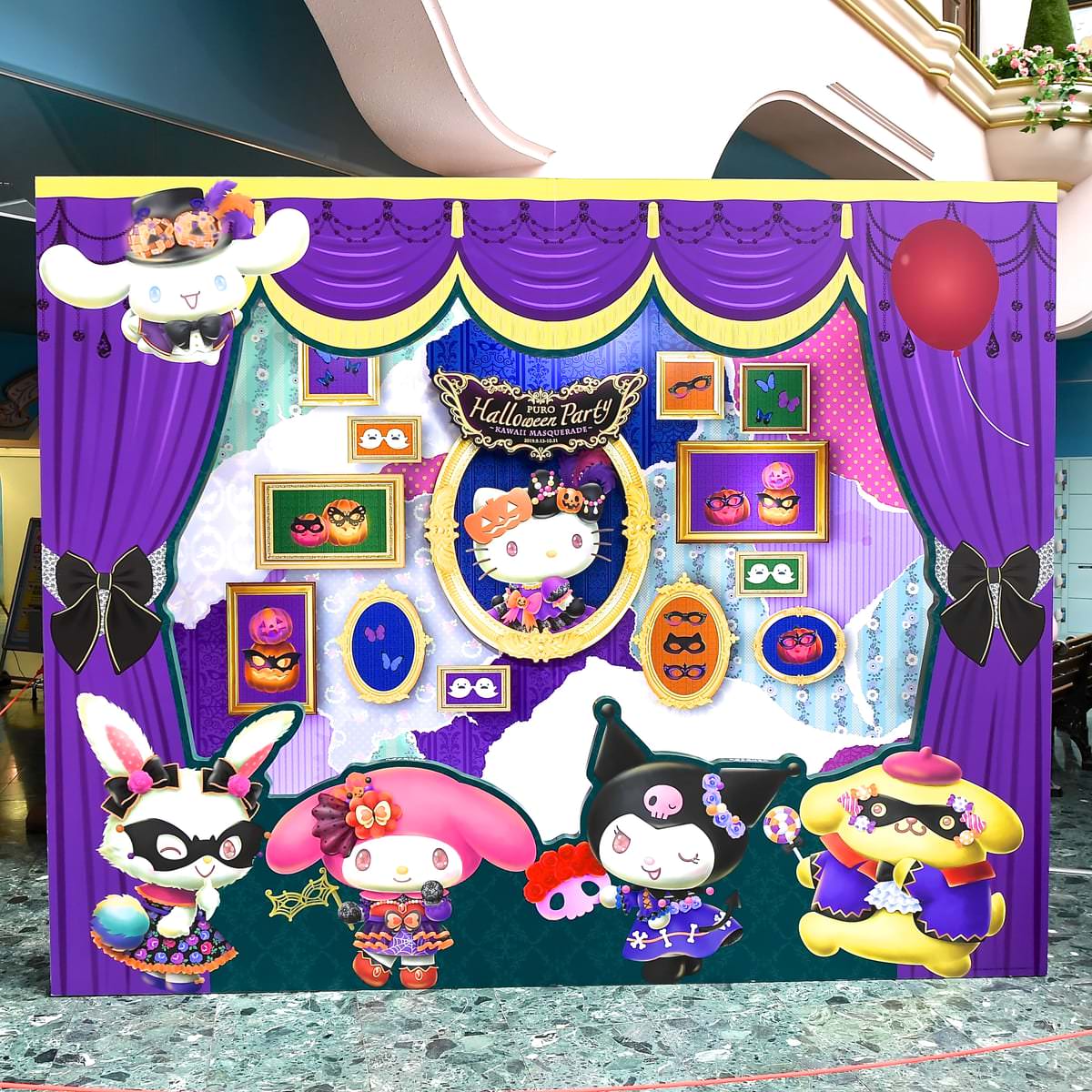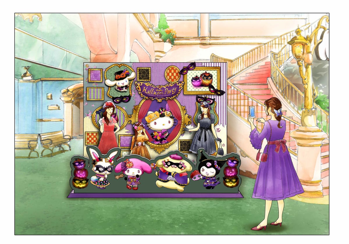 ドレスと仮面でドレスアップしたサンリオキャラクターたちと写真が撮影できる新作フォトスポットが3F レインボーホールに登場します。