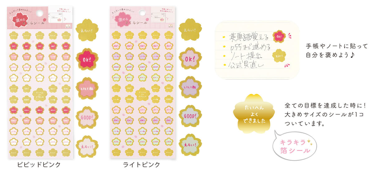 自分を褒めてくれるさまざまな言葉が書かれた、さくら形のシールです。