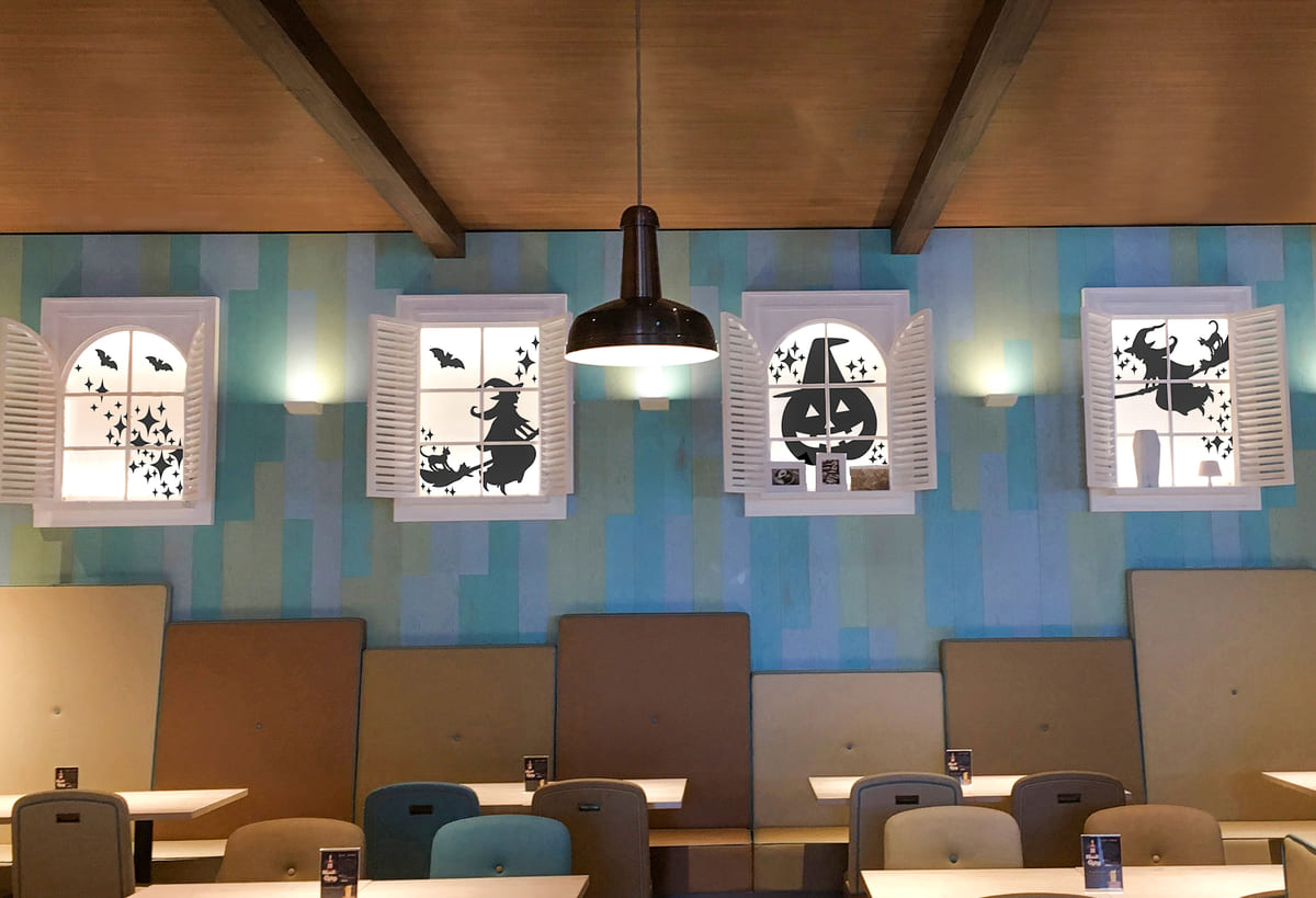 装飾デザインは、1階エントランスから3階レストランまでを、魔女がハロウィーンパーティーへ案内するイメージで施されています。