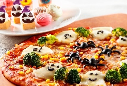 ちょっぴりコワくてかわいい見た目の、目玉やお化けの顔などをモチーフにしたハロウィーンスイーツ5種と、レストランの石窯で焼き上げた、ブラックオリーブをクモに見立てる“いたずらトッピング”をしたピッツァが提供されます。