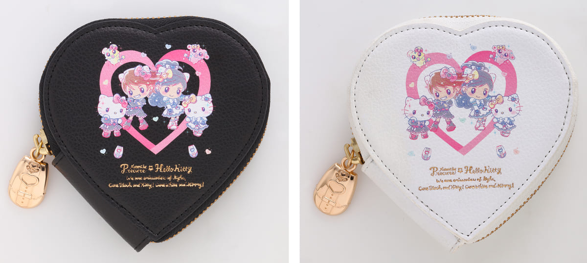 ハート型のケース中央に「ふたりはプリキュア×ハローキティ」のアートが採用された「レザーハートコインケース」