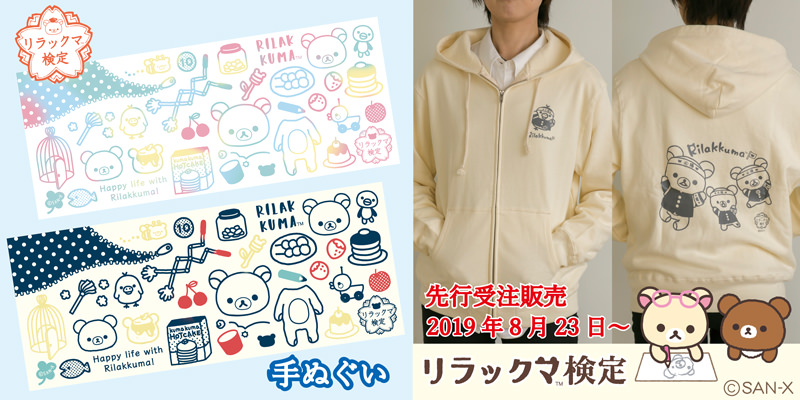 「リラックマ検定」オリジナルデザインの「手ぬぐい」が2019年9月16日(月)まで、「パーカー」が2019年10月20日(日)まで、サンエックスネットショップにて先行受注販売の注文受付を開始。