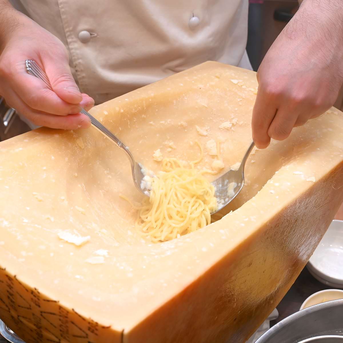 生パスタはイタリア産チーズで豪快に仕上げを行います。