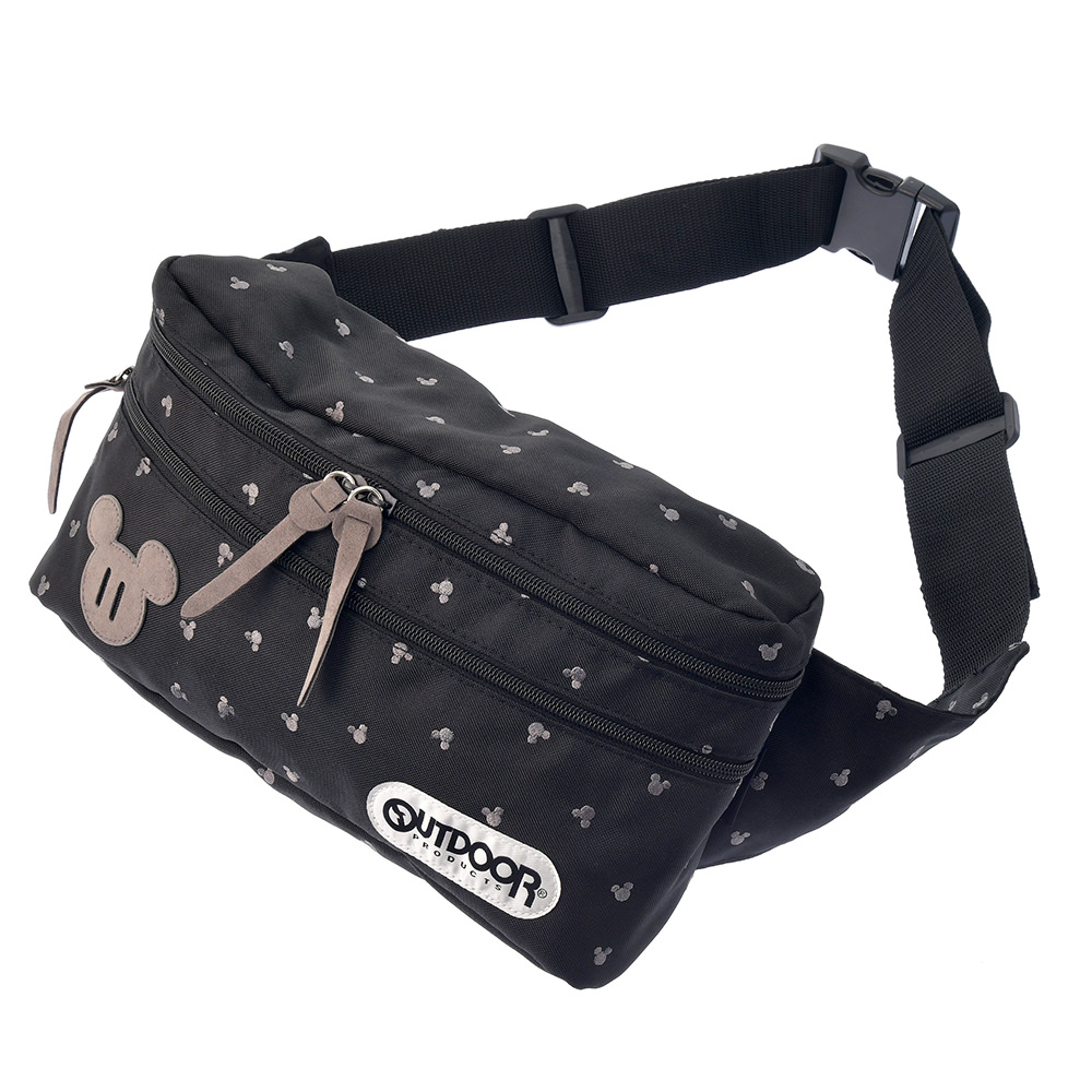 「ミッキーマウス」のアイコン刺繍が総柄で施されたウエストポーチ。