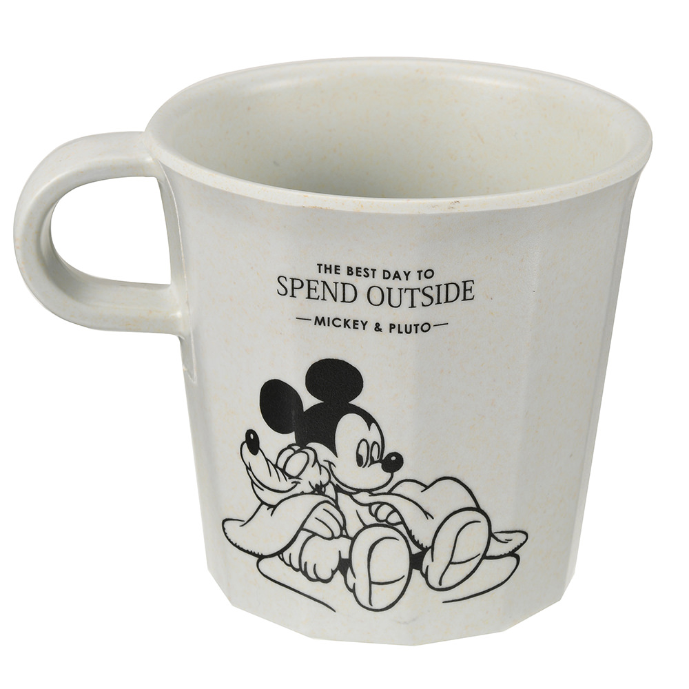 中央にモノトーンで「ミッキーマウス」と「プルート」が描かれたコップ。