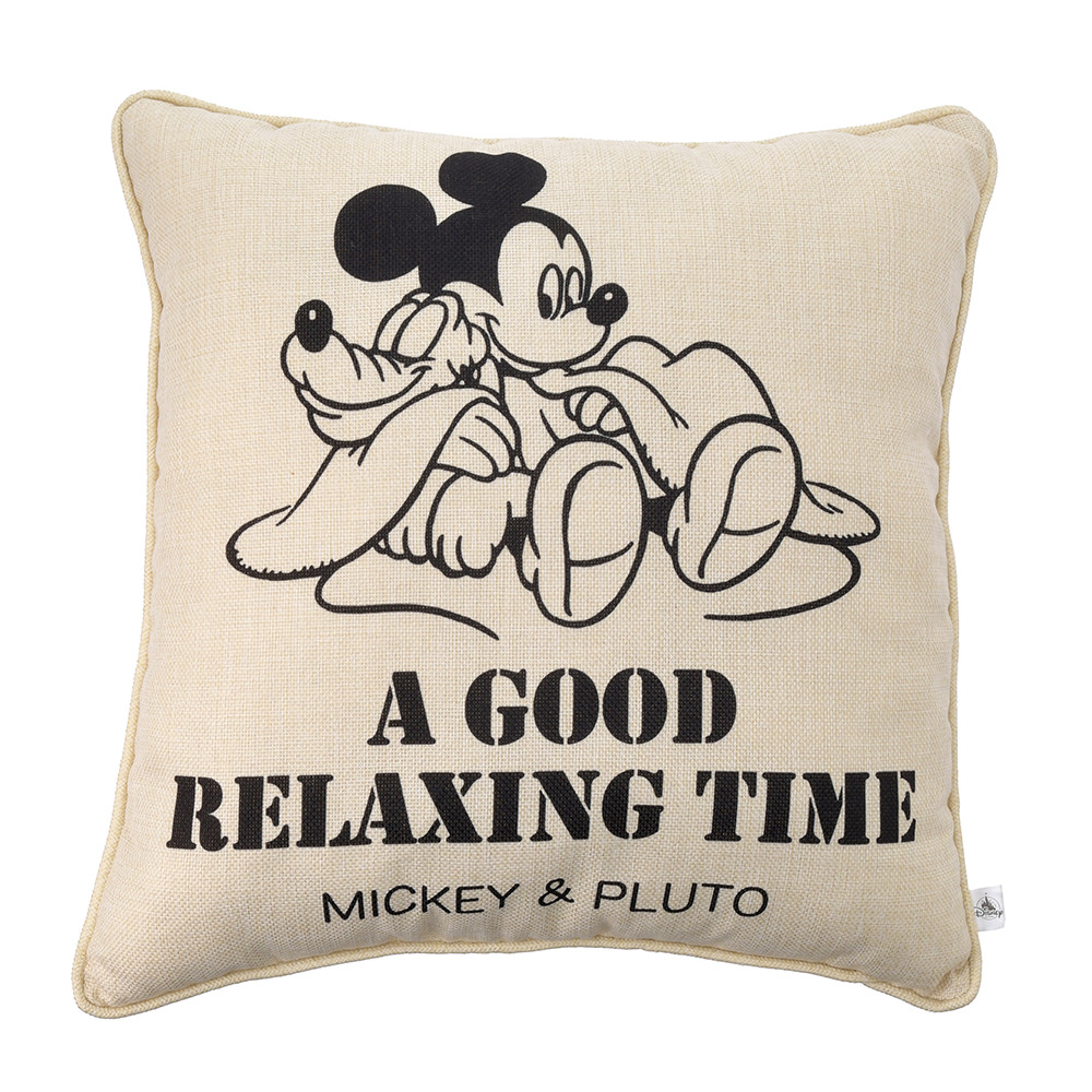 「ミッキーマウス」の膝の上で安心して眠る「プルート」が描かれたクッション。