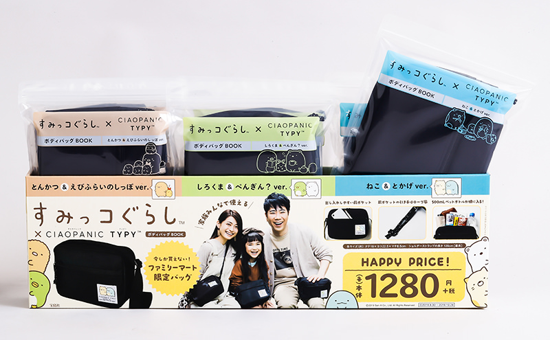 『すみっコぐらし×CIAOPANIC TYPY ショルダーバッグBOOK』は書店で、『すみっコぐらし×CIAOPANIC TYPY ボディバッグBOOK』はファミリーマートで2019年8月30日から販売中です。