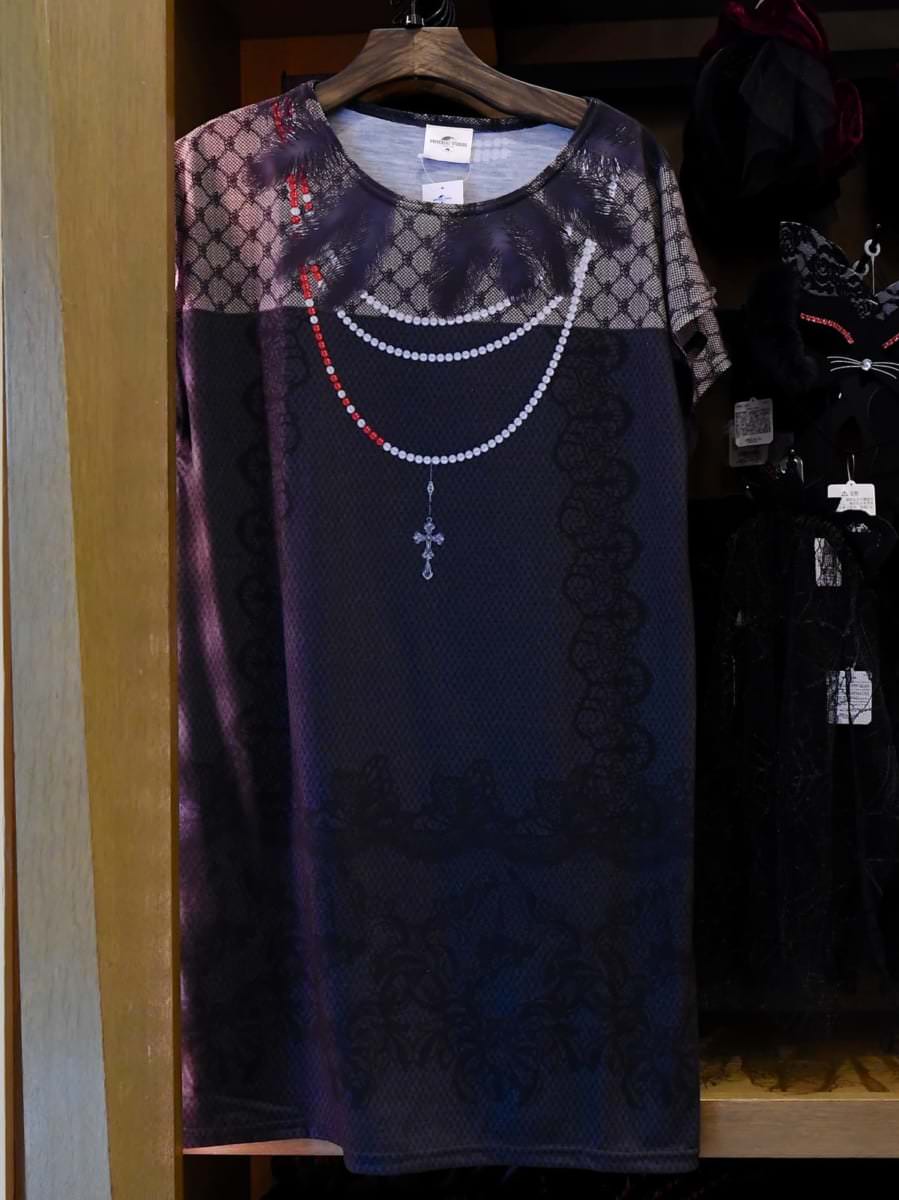 転写でプリントされたレースや羽、ネックレスが表現されたシックなチュニック。