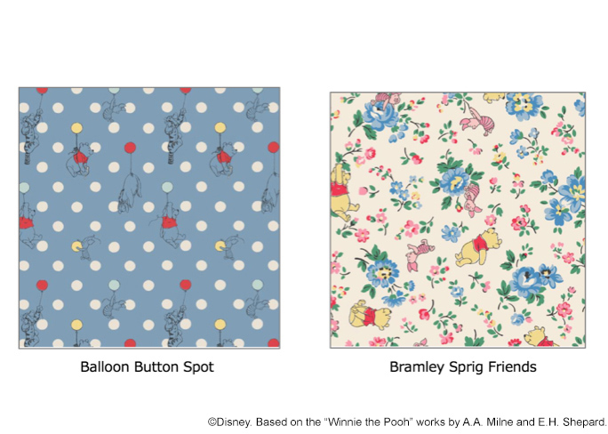 キャス キッドソンのアイコニックなプリント「ボタンスポット」に、フレッシュなカラーを乗せたプーさんのトレードマークの風船が重なり、一緒にふわふわと宙に浮いたキャラクターたちが登場します。