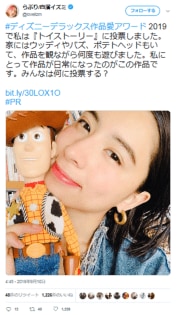 ファッションモデルの「ラブリ」さんは、小さい頃に作品を見ながら何度も遊んでいたという、大好きな「トイ・ストーリー」のキャラクターとアップのツーショットを投稿。