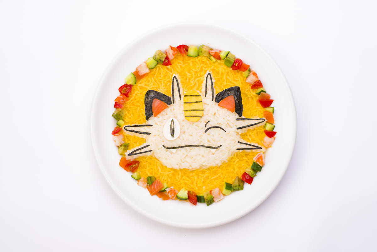 ポケモンカフェ2店舗に、心斎橋店のオープンを記念した期間限定メニュー「にっこりニャースの海老とアボカド彩りちらしご飯」が登場。