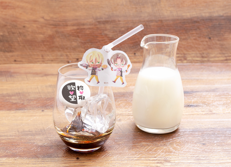 「玲央」と「真武」のイラストがマドラータグに描かれた「自分で混ぜる欲望渦巻くコーヒーミルク」