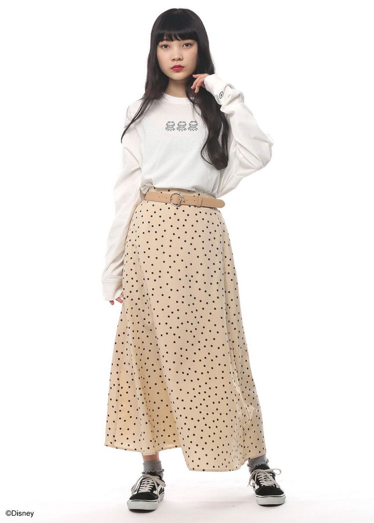 ロングスカートとスニーカーを合わせれば、休日のらくちんコーデが完成。